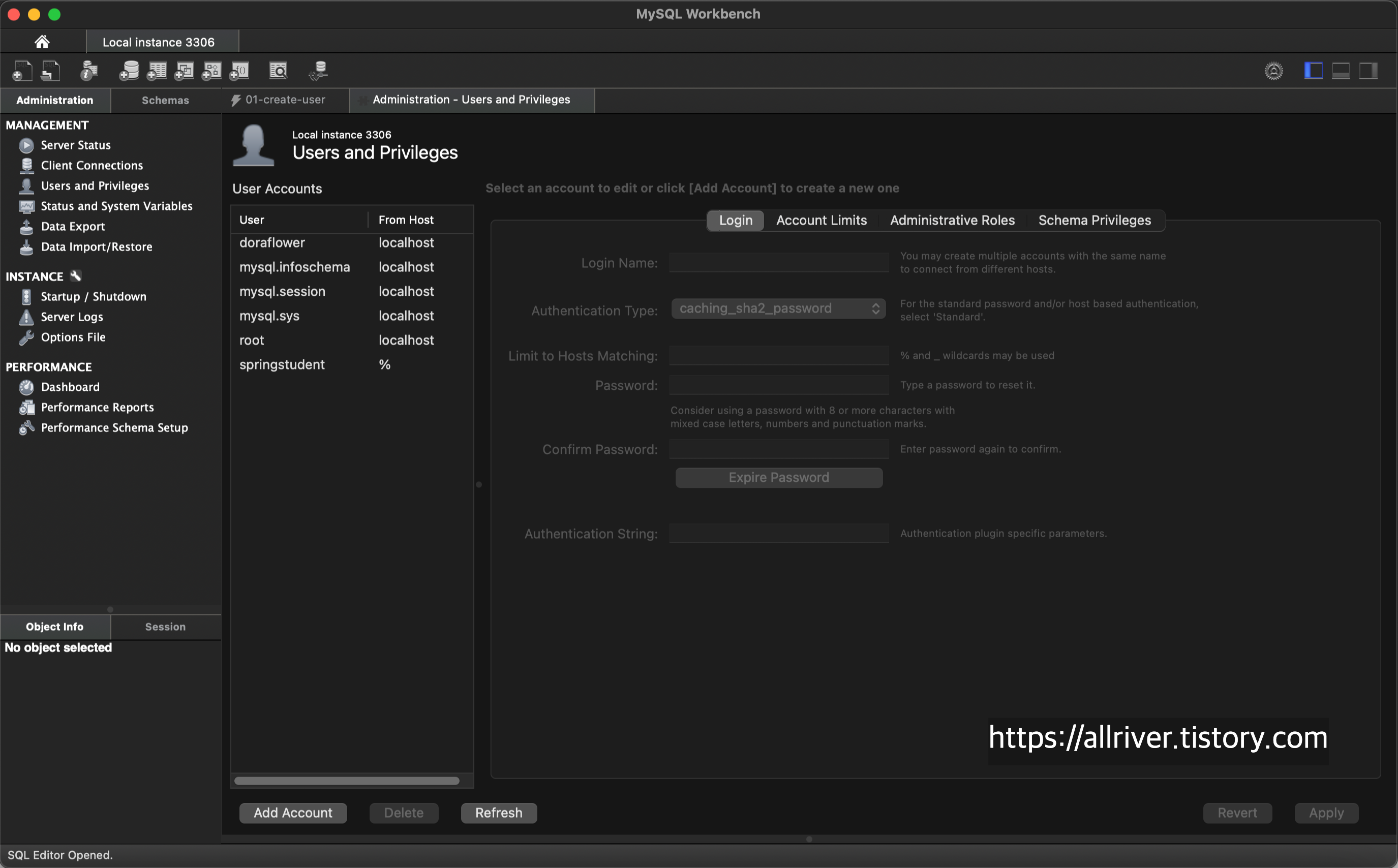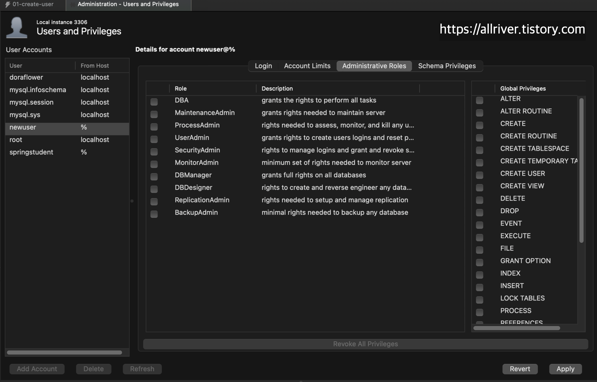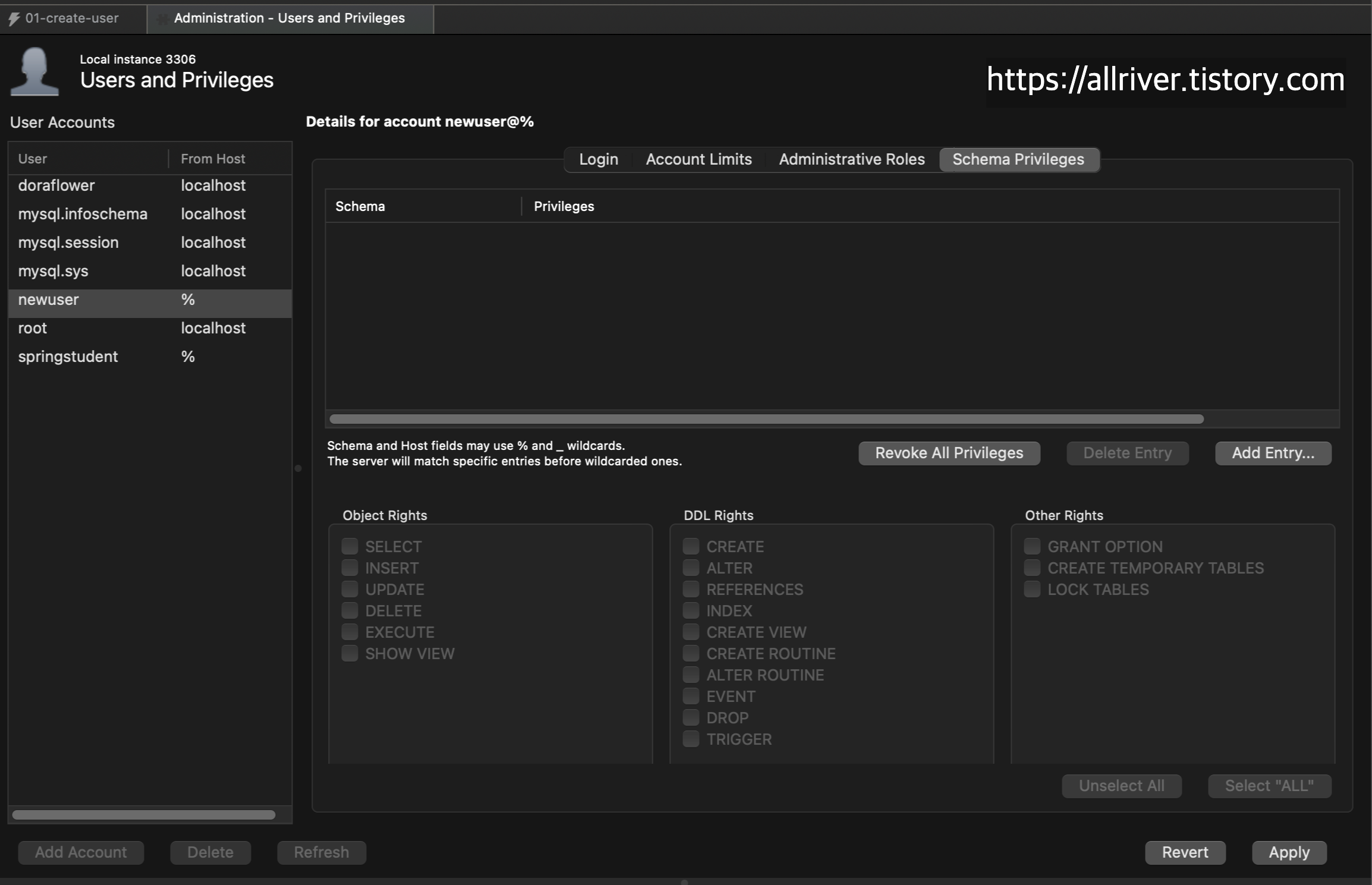 6. Schema Privileges - Add Entry에서 생성된 DB 추가 가능