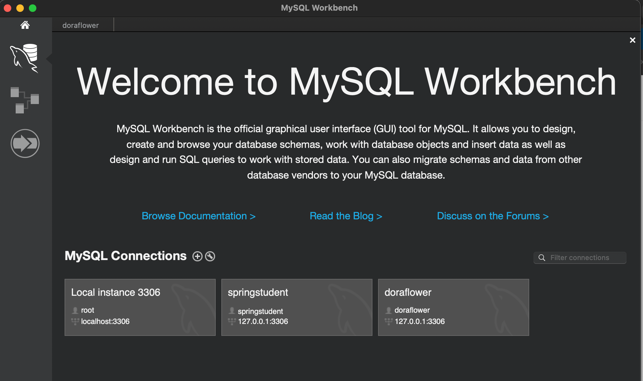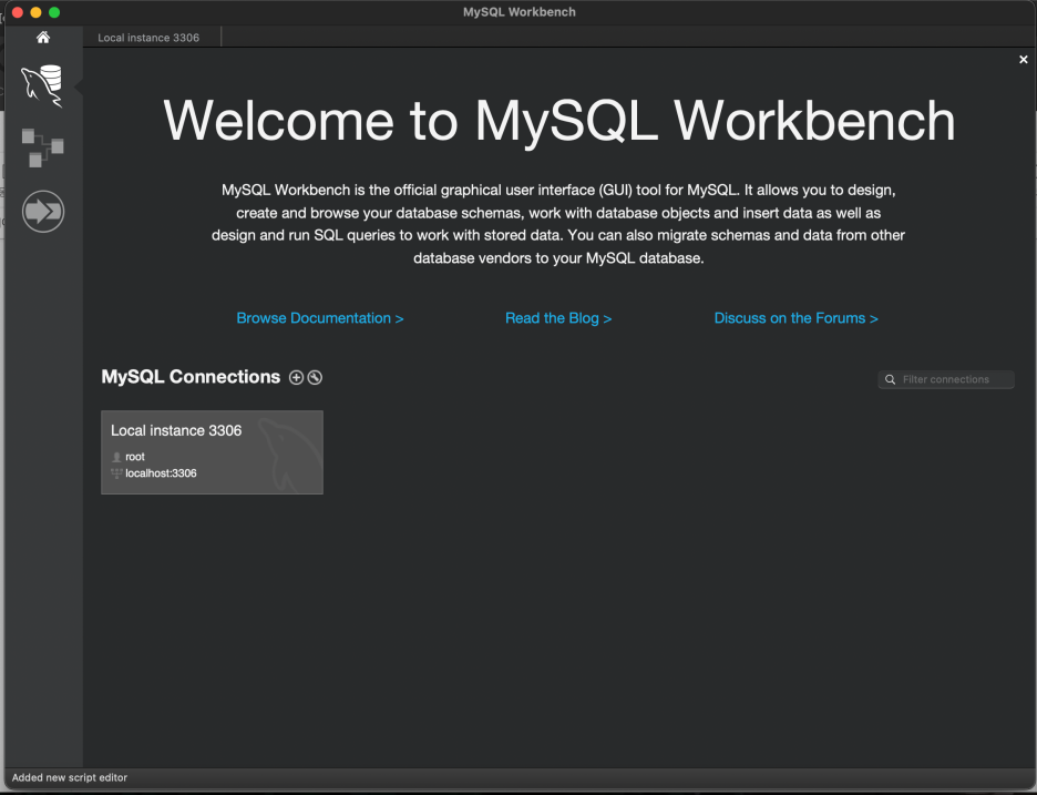 ✓ MySQL Connections 옆 + 버튼 클릭해서 새로운 connection 생성!