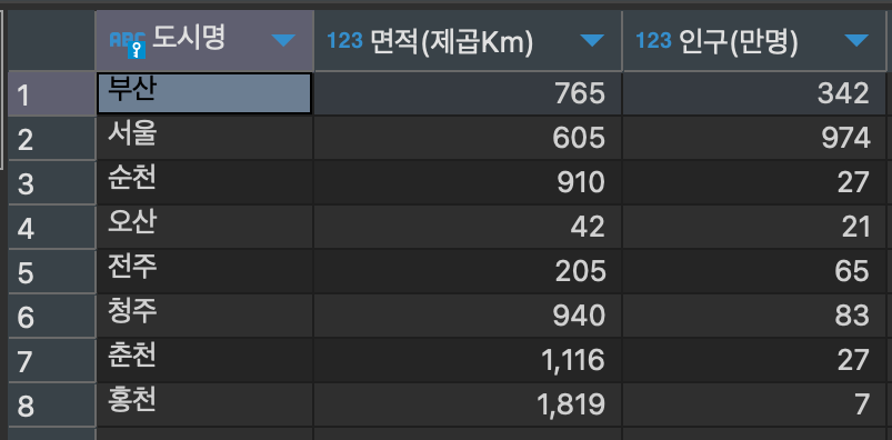 ✔️ 두번째 쿼리문은 지역과 도시명, 인구수를 출력하는데 필드 순서를 마음대로 지정 가능.
