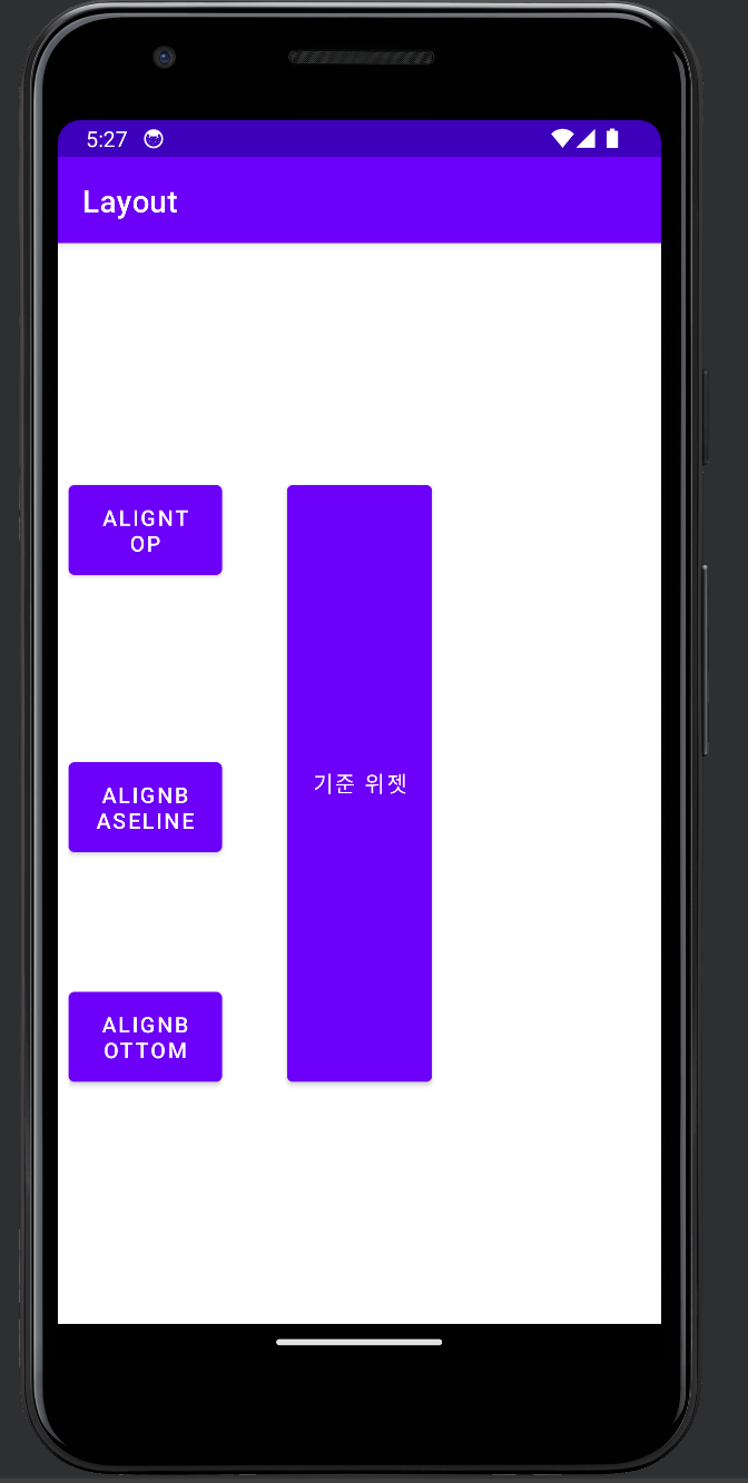 - 상단, 중앙, 하단 layout_alignTop, layout_alignBaseline, layout_alignBottom