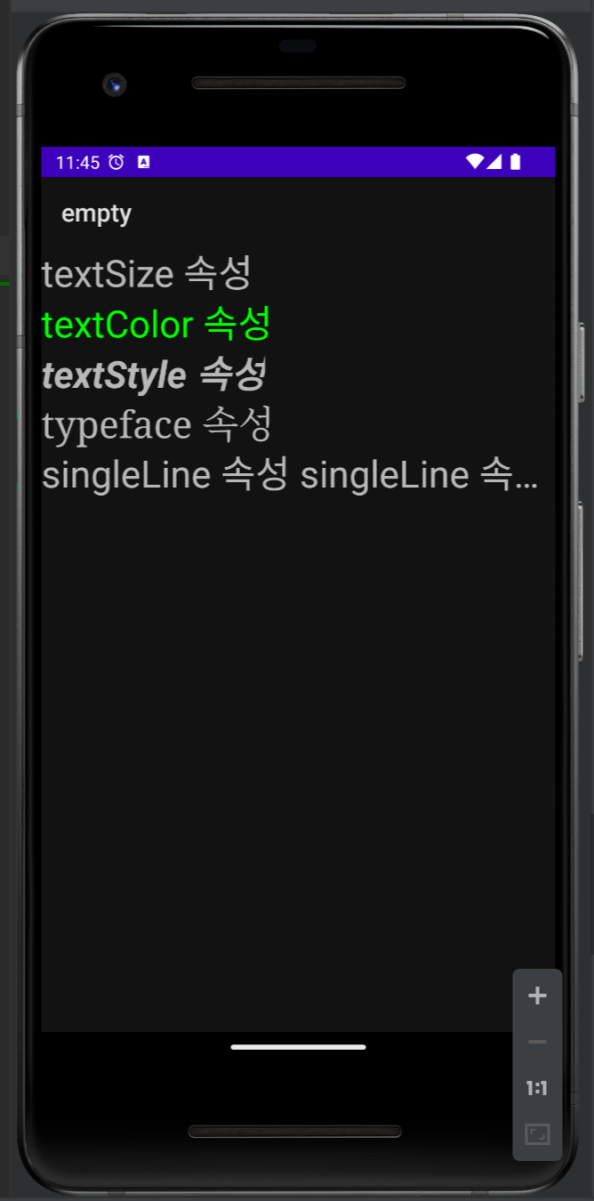 | textSize | 글자의 크기를 dp, px, in, mm, sp 단위로 지정 |