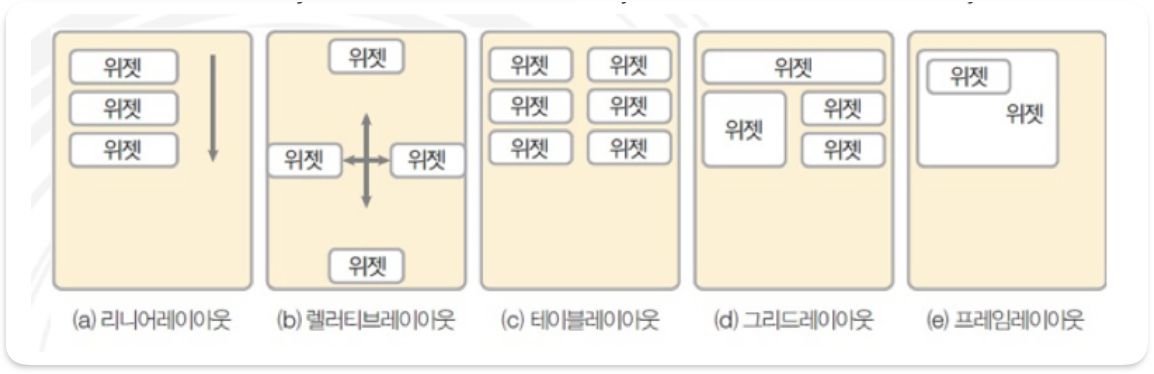 레이아웃은 ViewGroup 클래스로부터 상속받으며 내부에 무엇을 담는 용도로 쓰임. 즉 레이아웃 안에 존재하는 위젯을 배치하게 해준다.