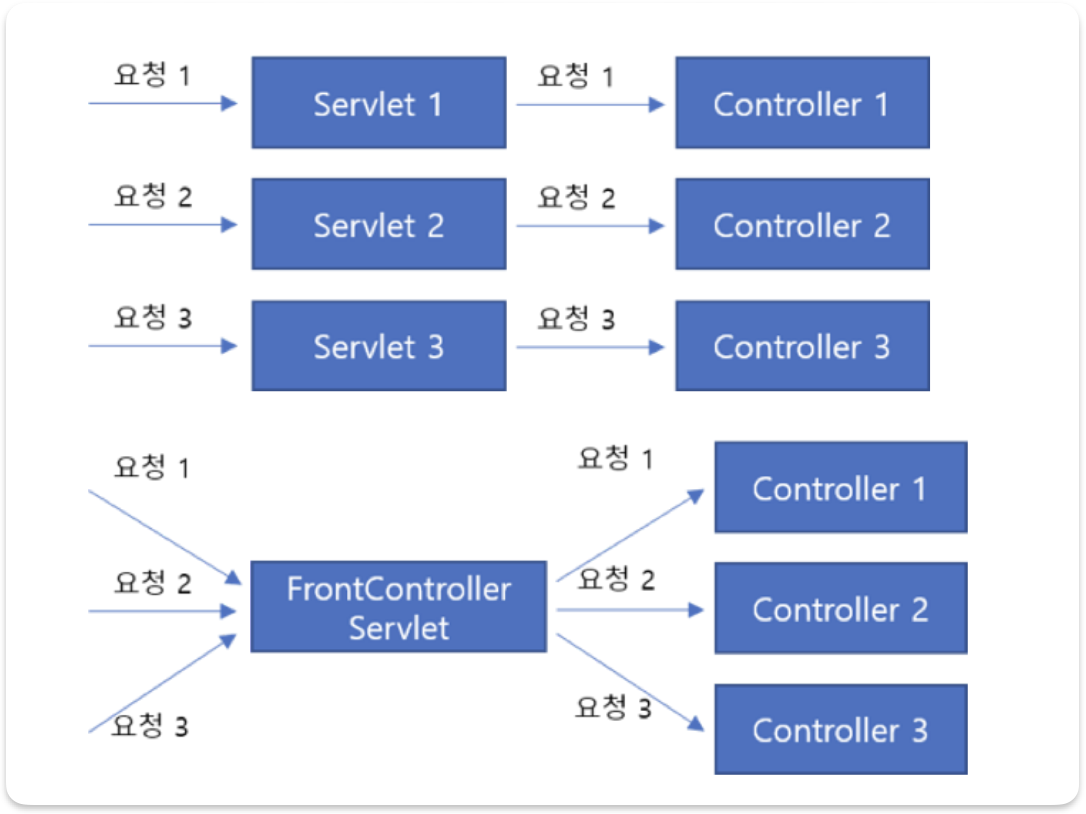 ✓ Front-Controller 패턴을 이용하면 모든 요청이 반드시 하나의 객체를 지나서 처리되기 때문에 모든 공통적인 처리를 프론트 컨트롤러에서 처리할 수 있게 됨